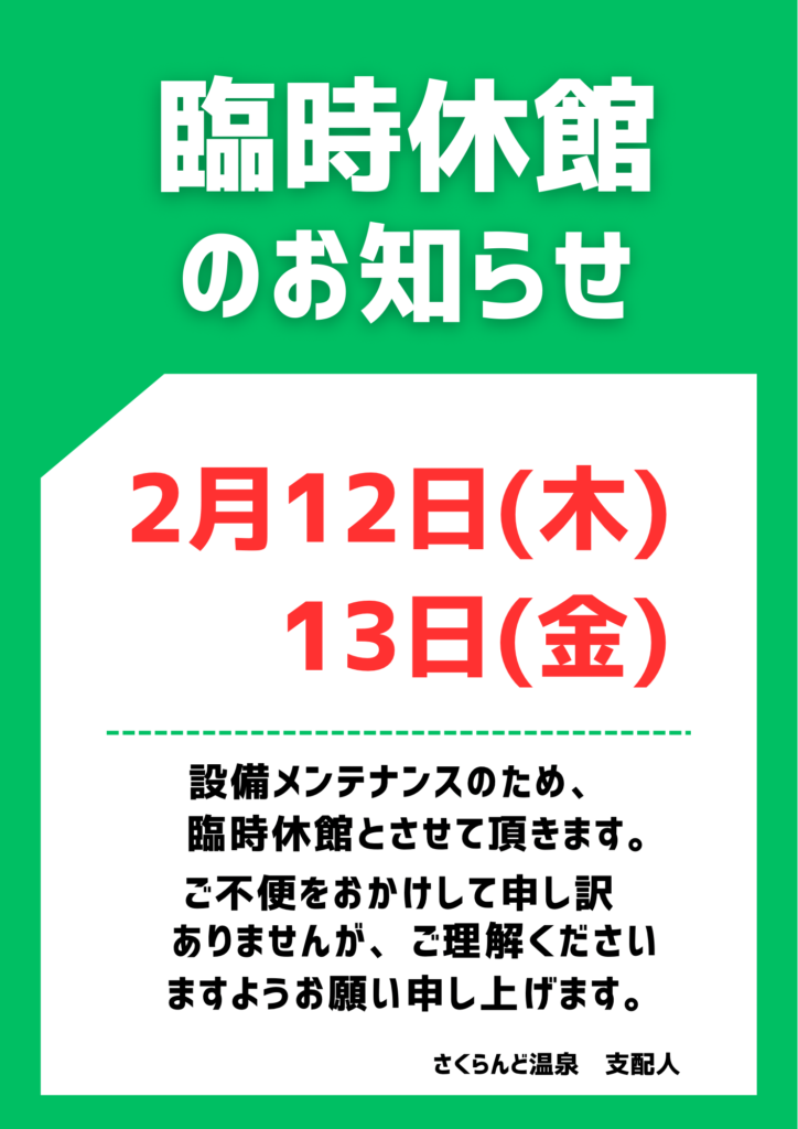 2月12日(木)13日(金) 臨時休館させて頂きます。