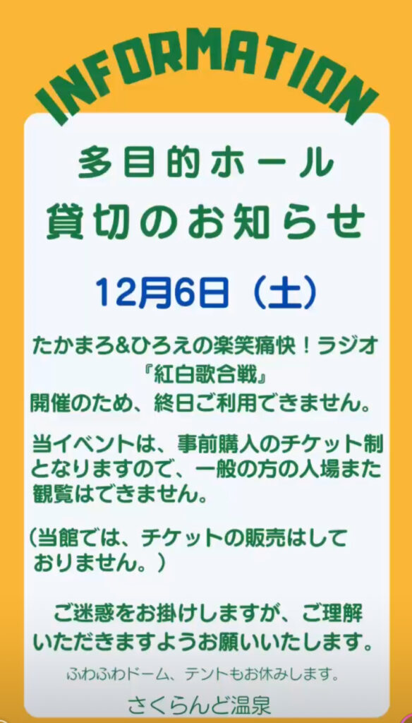 紅白歌合戦 (有料イベント事前申込) 開催の為.多目的ホールは貸切となります。